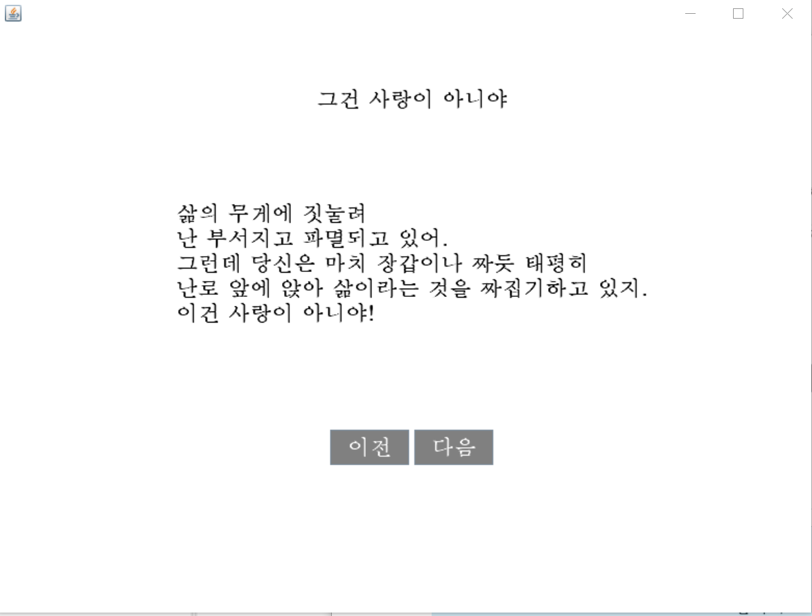 시의 제목인 poemTitle(JLabel), 시의 내용인 poemContent(JTextArea), 이전버튼과 다음버튼을 뜻하는 backButton, frontButton(JButton) 객체를 선언한다.